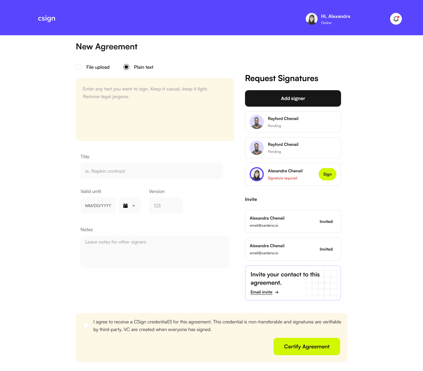 Agreements are signed with SSI Verifiable Credential and then certified on the blockchain.